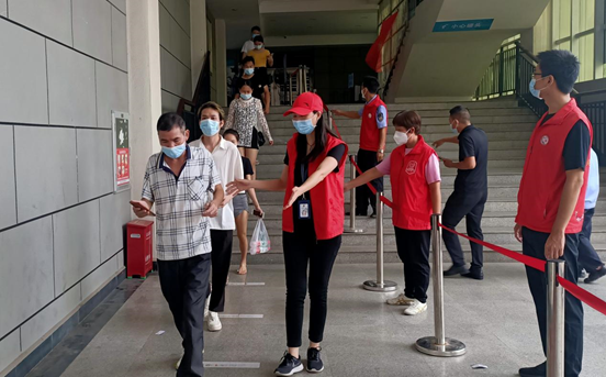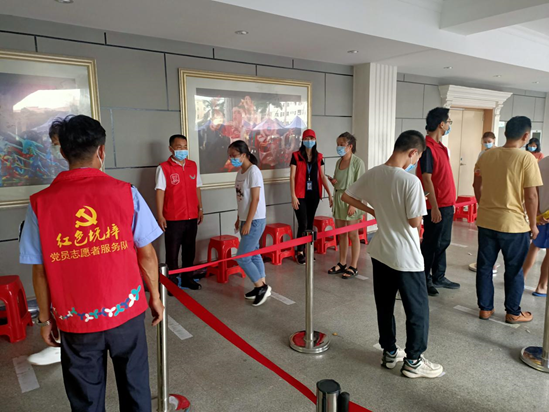 为维护好检测点现场秩序,坑梓街道通过广泛发动,每天动员约20-30名党员志愿者参与核酸检测点的查验健康码、维持秩序、消杀保洁等工作。他们身着“红马甲”或“防护服”,在高温中、在烈日下,始终坚守。对于老弱病残孕等需要帮助的特殊人群,影剧院检测点开辟绿色快捷通道,实行随到随检,并提供饮水等暖心服务。对于年迈等不会使用微信的居民,安排志愿者耐心指引,帮助其扫码填报信息。