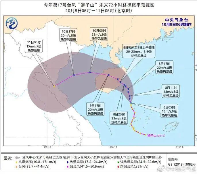 预计,“狮子山”将以每小时10公里左右的速度向北偏西方向移动,强度略有加强,将于8日夜间至9日上午在海南岛东部一带沿海登陆(20-23米/秒,8-9级,热带风暴级),登陆后将转向偏西方向移动,穿过海南岛后,趋向越南北部。