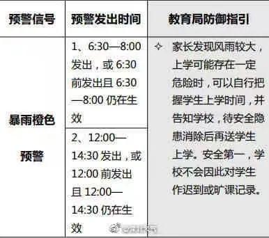 暴雨橙色预警在以下时间发布时,学生家长发现风雨较大,上学可能存在一定危险时,可自行把握学生上学时间;并告知学校,待安全隐患消除后再送学生上学。