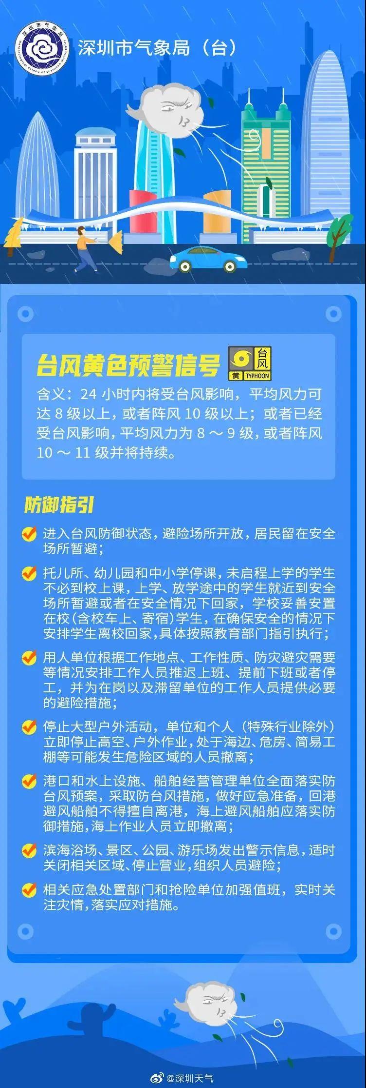 深圳市气象台2021年10月12日11时30分将深汕特别合作区台风蓝色预警升级为黄色,深汕合作区进入台风防御状态,全区托儿所、幼儿园和中小学停课,具体按照教育部门指引执行。预计受台风“圆规”影响,12-13日,我区沿海、高地和海面最大阵风将达到11-13级。居民应紧闭门窗,停止户外作业和活动,在安全场所暂避,避难场所可通过12345电话查询。同时,会展及农贸市场、滨海浴场、景区、公园、游乐场等适时停止营业。