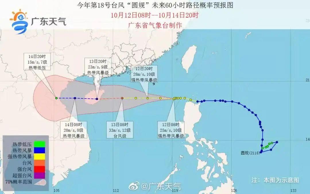 据区气象服务工作组消息,第18号台风“圆规”12日凌晨进入南海已加强为强热带风暴,12日10时位于深汕合作区东南方约610公里的南海海面,之后以25公里左右的时速快速西行,强度缓慢加强,较大可能于13日在海南岛东部沿海登陆。12日夜间至13日凌晨距离深汕合作区最近,从深汕合作区偏南方350公里左右的海面掠过。