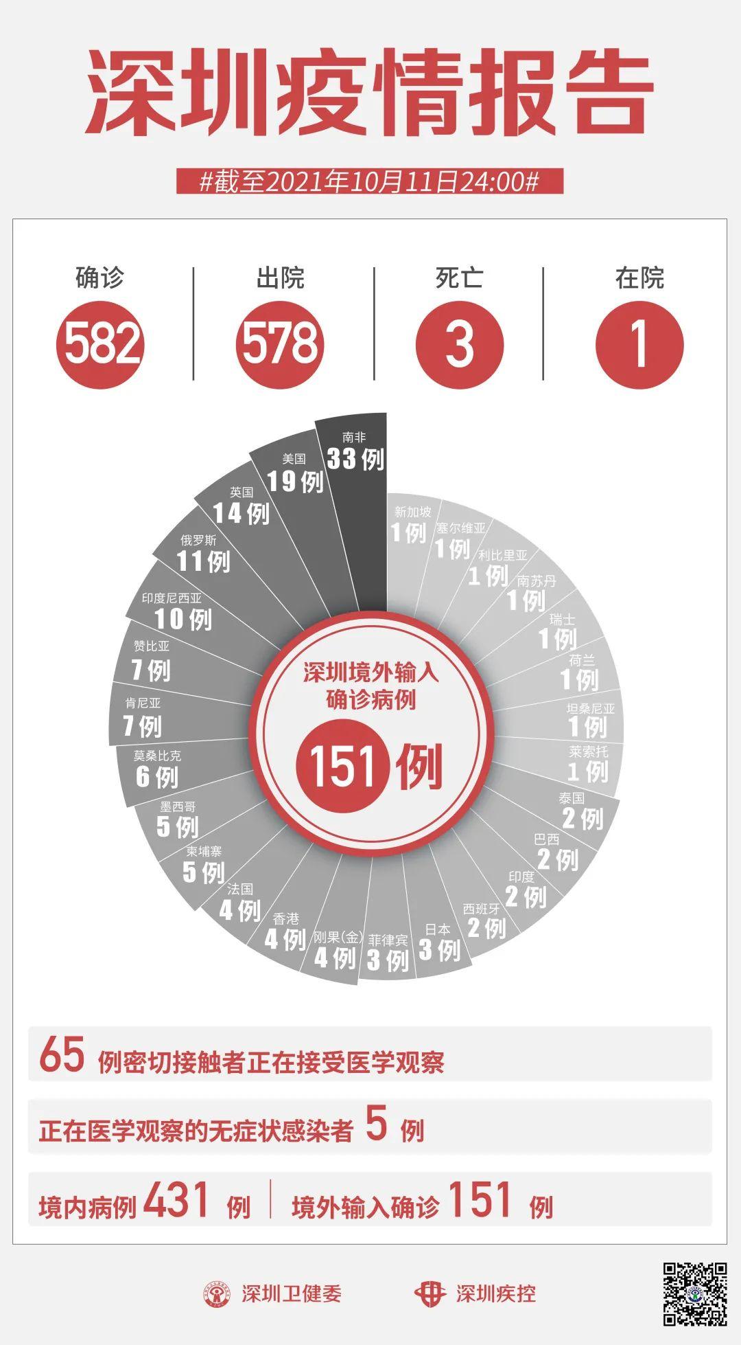 截至10月11日24时,深圳市累计报告新冠肺炎确诊病例582例。