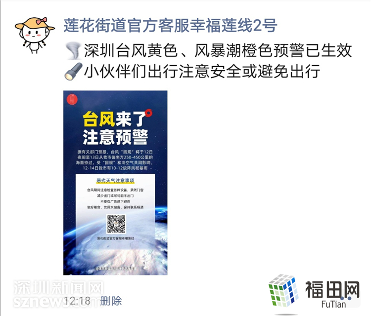 此外,福田区还开展恶劣天气关爱流浪乞讨人员救助行动,对辖区范围内可能聚集流浪乞讨人员的场所进行密集排查,劝离并救助流浪乞讨人员。通过官方客服微信号及时发布台风预警,线上及时与居民沟通,提醒辖区居民停止户外作业、注意安全。
