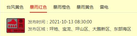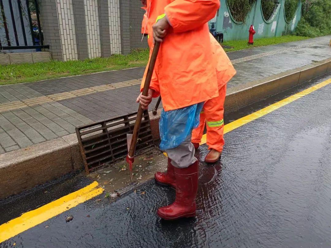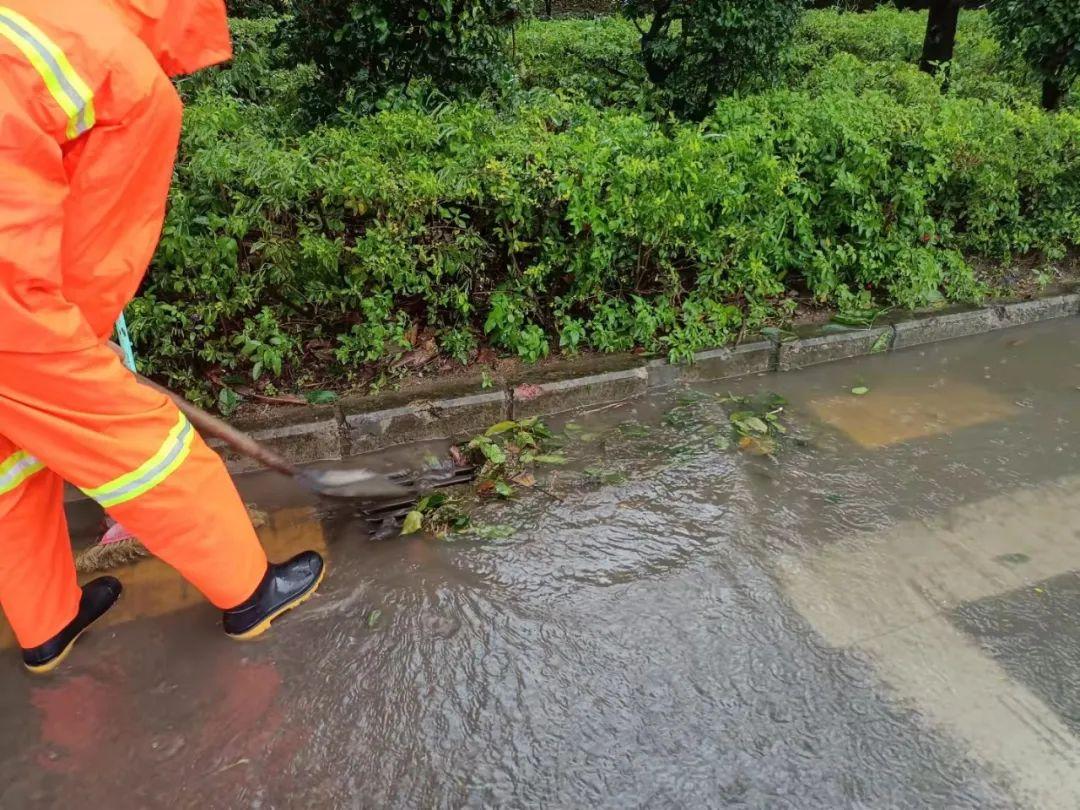 台风吹落的树叶堵住排水口,10月13日上午,龙岗管理局冒着大雨清理红领巾路、龙腾路积水点。