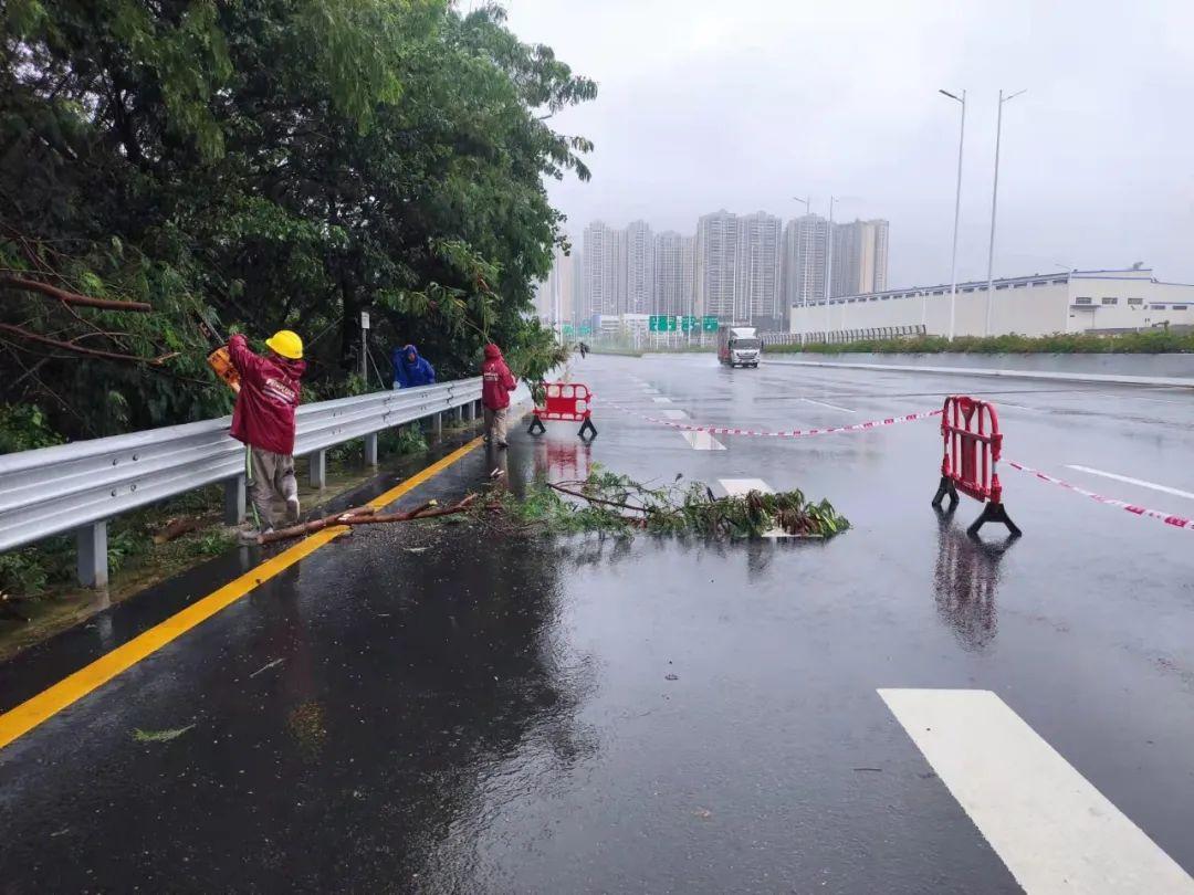 大风暴雨中新深线树枝倒塌,养护人员及时清理路障。