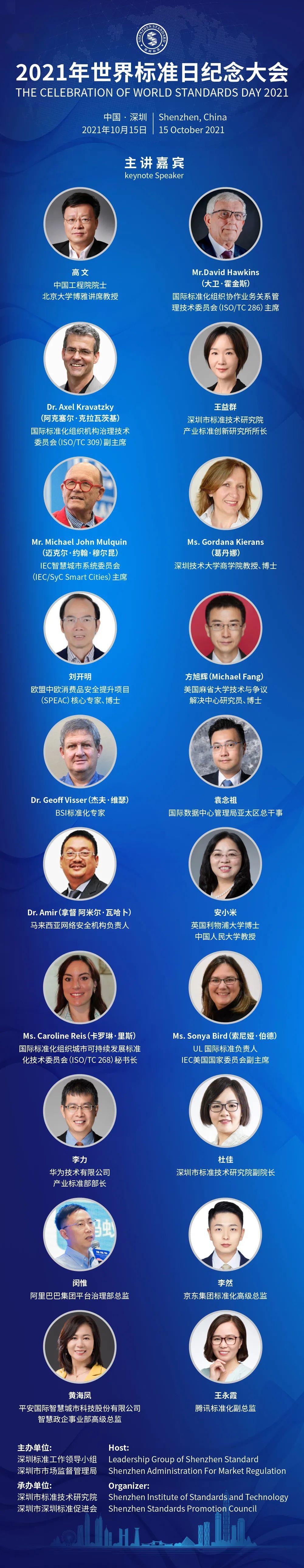 本次会议邀请了高文院士,以及来自ISO、IEC、ITU、BSI、UL、美国麻省大学技术与争议解决中心、马来西亚网络安全机构、国际数据中心管理局、中国人民大学、深圳技术大学、深圳市标准技术研究院、华为、阿里巴巴、腾讯、京东、平安等国际区域组织或企事业单位的十几位国内外权威专家。