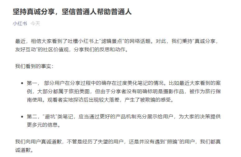 最近,相信大家看到了吐槽小红书上“滤镜景点”的网络话题。对此,我们秉持“真诚分享,友好互动”的社区价值观,分享我们的反思和动作。