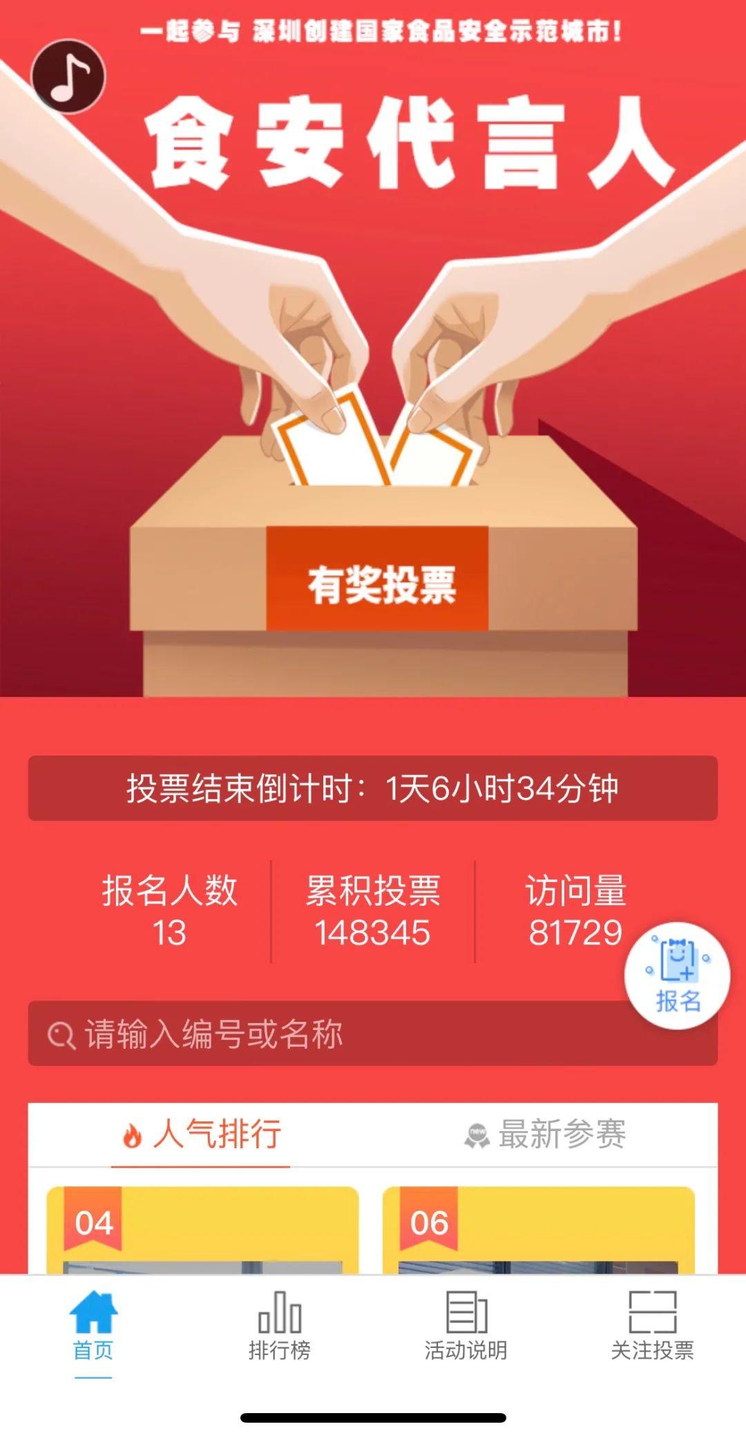 3. 点击“深圳食安代言人投票”,选择您喜爱的选手进行投票。