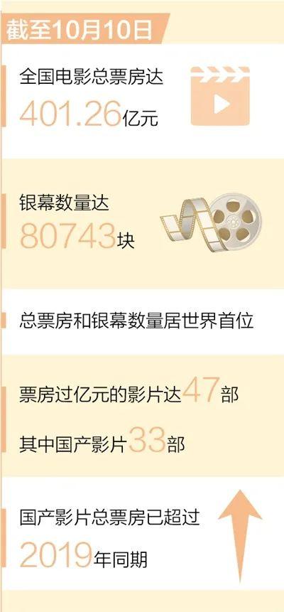 国家电影局的数据显示:截至10月10日,今年以来全国电影总票房超400亿元,达401.26亿元,银幕数量达80743块,总票房和银幕数量居世界首位;票房过亿元的影片达47部,其中国产影片33部,国产影片总票房已超过2019年同期。