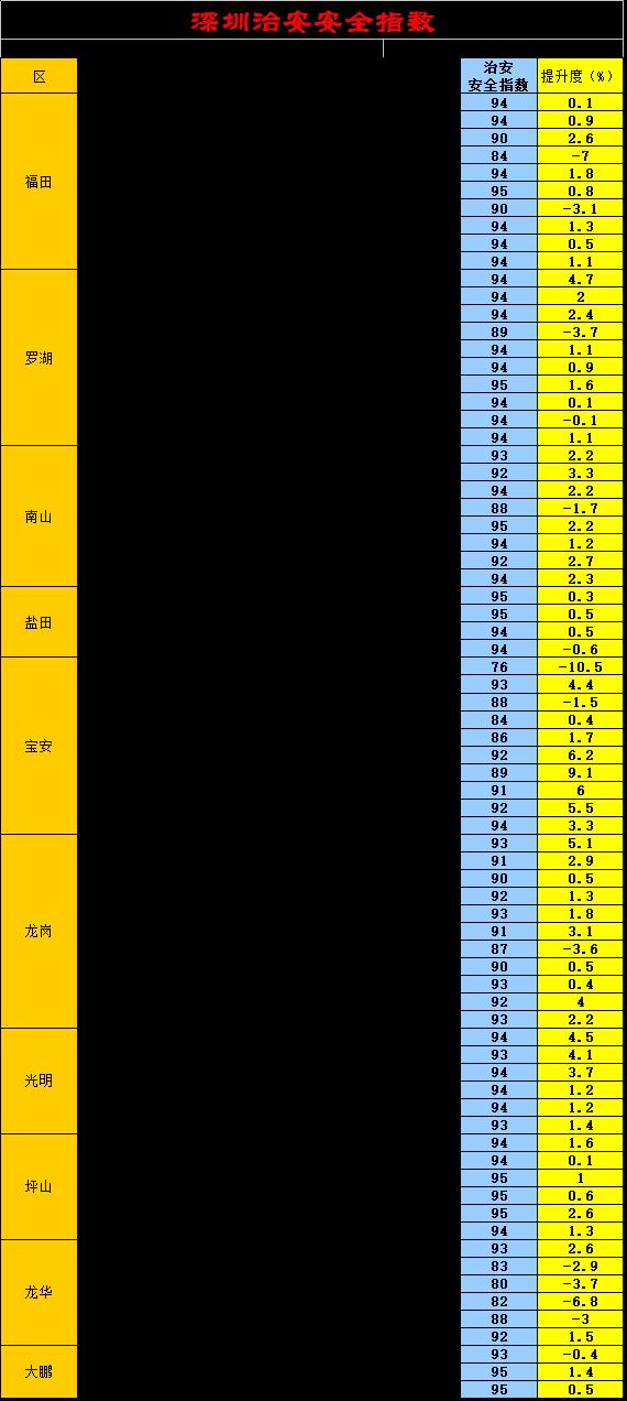 为进一步优化指数发布工作,使指数既反映区域治安安全现状,又体现阶段变化,从2020年第1期开始,指数名称更改为深圳治安安全指数,并按照递远递减每期不同权重原则,计算出每个区域的阶段提升度,一并予以发布。