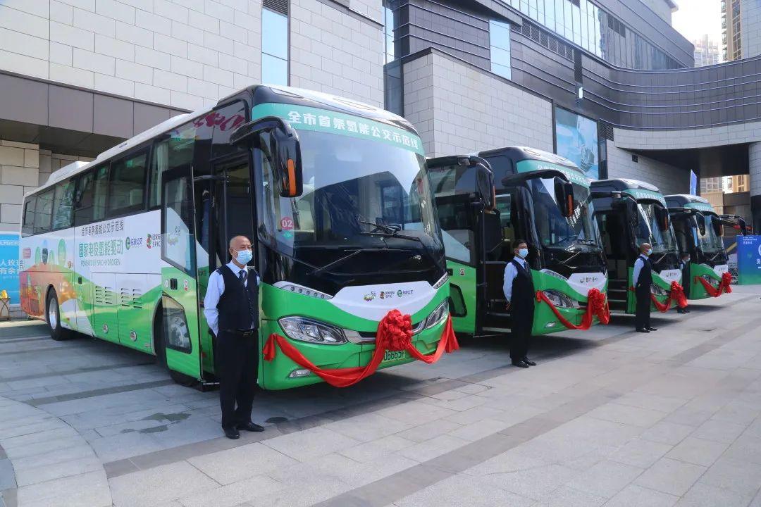 与传统公交相比,氢燃料车辆工作原理由氢气和氧气的化学反应产生电能,由电能驱动电机从而实现行驶动力源。
