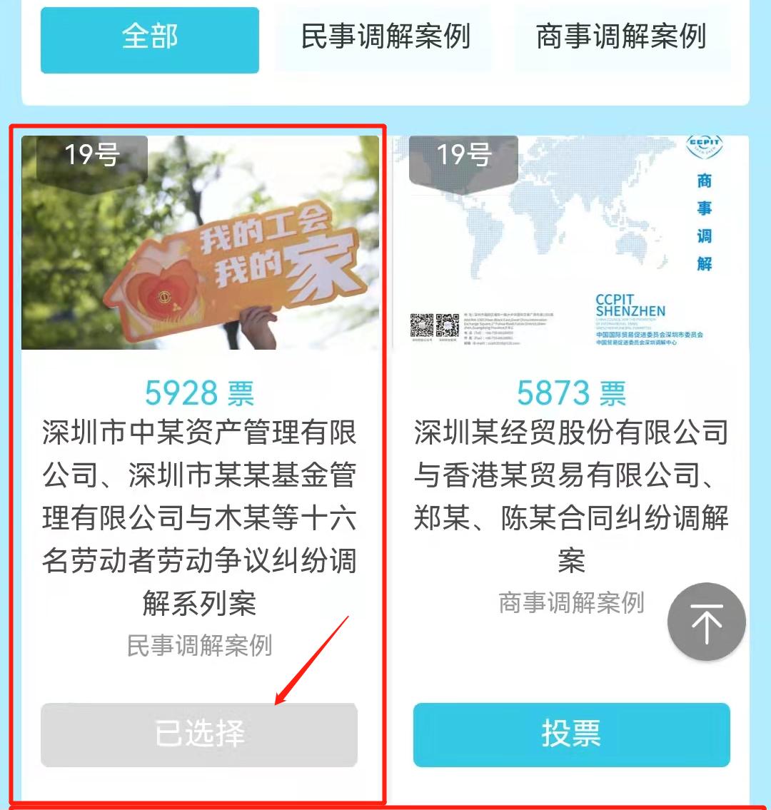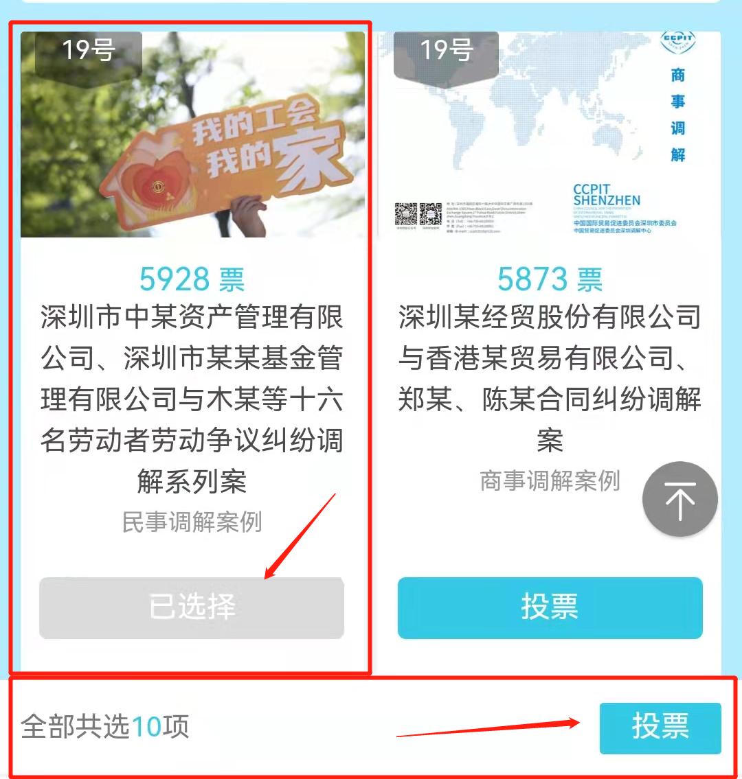 ② 然后在“民事调解案例”中勾选其他4个案例,在“商事调解案例”中勾选5个案例,总共10个案例,最后点击投票。