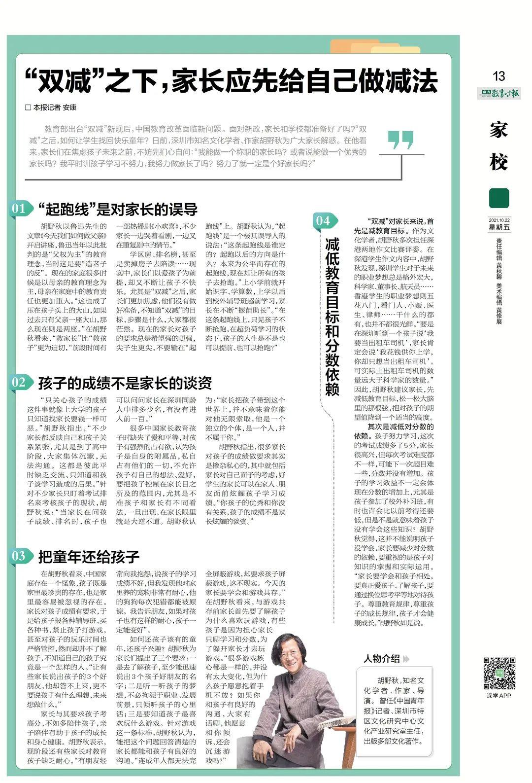 教育部出台“双减”新规后,中国教育改革面临新问题。面对新政,家长和学校都准备好了吗?“双减”之后,如何让学生找回快乐童年?日前,深圳市著名文化学者、作家胡野秋为广大家长解惑。在他看来,家长们在焦虑孩子未来之前,不妨先扪心自问:“我能做一个称职的家长吗?或者说能做一个优秀的家长吗?我平时训孩子学习不努力,我努力做家长了吗?努力了就一定是个好家长吗?”