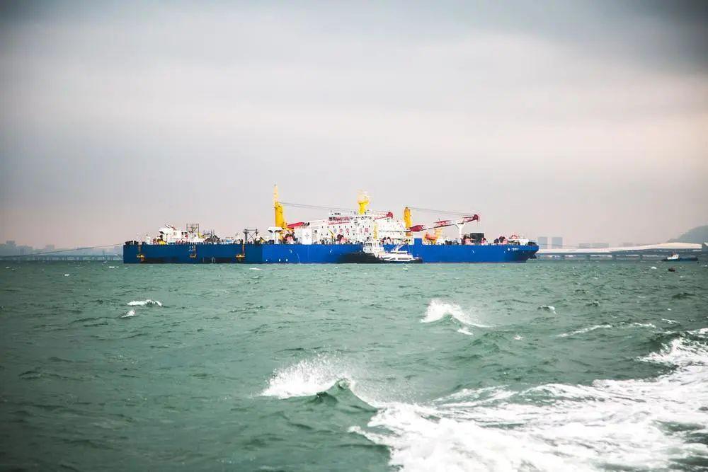 世界首制沉管浮运安装一体船提带E13管节劈浪启航,一路逆流、顶风、顶浪前行。