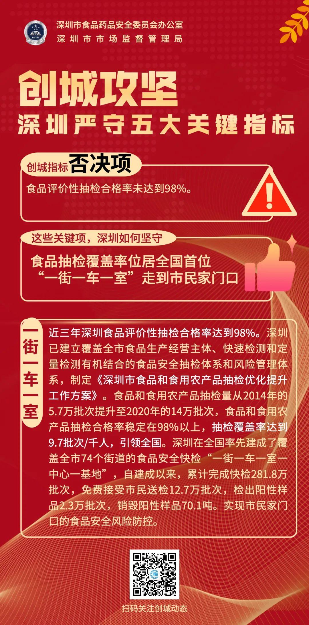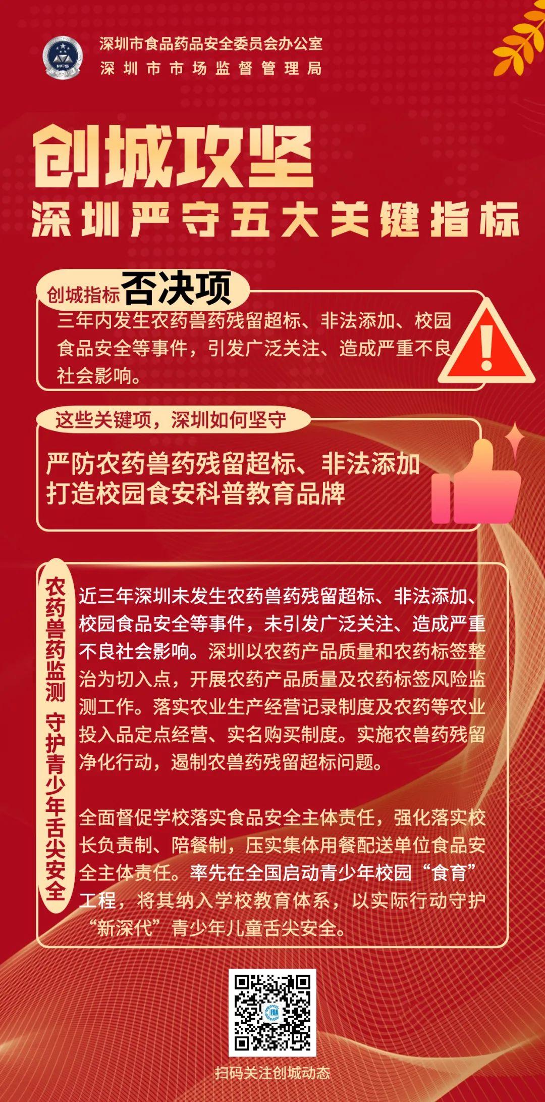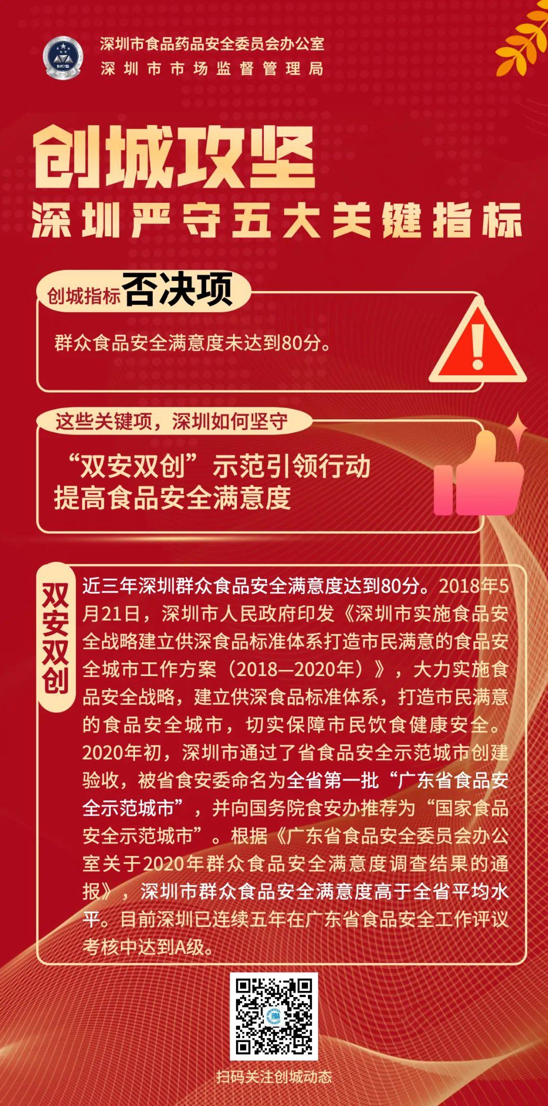 深圳自创建国家食品安全示范城市以来以市民的利益为出发点维护市民的“舌尖安全”经过多年的艰苦努力和不懈坚持深圳食安工作普遍达到创城评价细则要求创城要求里的这5件事必须牢牢守住底线 党政同责扛起食品安全重任三年内未发生重大及以上食品安全事故三年内未发生农药兽药残留超标非法添加、校园食品安全等事件群众食品安全满意度达到80分食品评价性抽检合格率达到98%这是底线,这也是生命线,深圳坚决做到食安君这就带大家看看深圳是怎么做到的吧!未来深圳还将持续落实创城各项指标加快补齐短板,严堵食安“漏洞”做到全民动员,创城合力守护“舌尖上的安全”食安君温馨提醒近期,国务院食安办将通过电话访问的形式对深圳市开展创建工作知晓率和食品安全满意度民意调查如果市民朋友有幸接到了全国社情民意调查热线12340请耐心接听、客观评价牢记最佳答案回答 我知道、我满意为创城努力、为深圳加油!编辑整理 深圳食药安办转载请注明以上内容点在看,大家看!