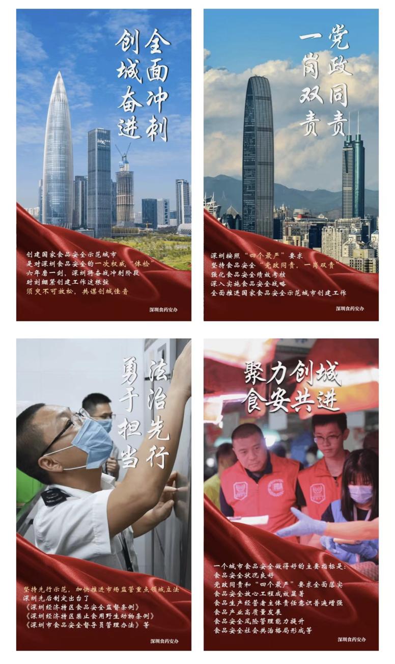 结合国庆节、中秋节等重要节假日,丰富创城工作宣传形式,利用语音提醒、短视频解读、海报及长图等视听图文手段加大创城参与度,提高市民对深圳创建国家食品安全示范城市工作的食品安全满意度和创建知晓率。