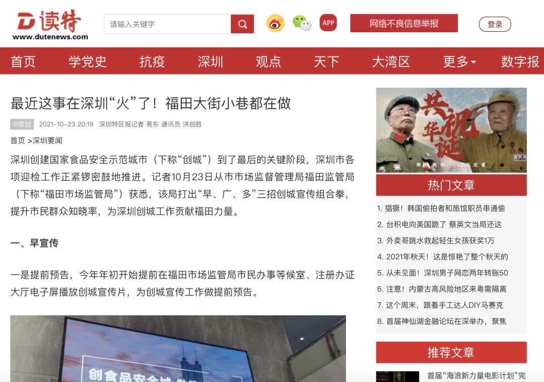 “深圳食药安办”联动新闻媒体和主流门户网站开展报道,借助深圳媒体和新媒体平台进行同步宣传推广,截至目前共发布创城系列稿件82篇。