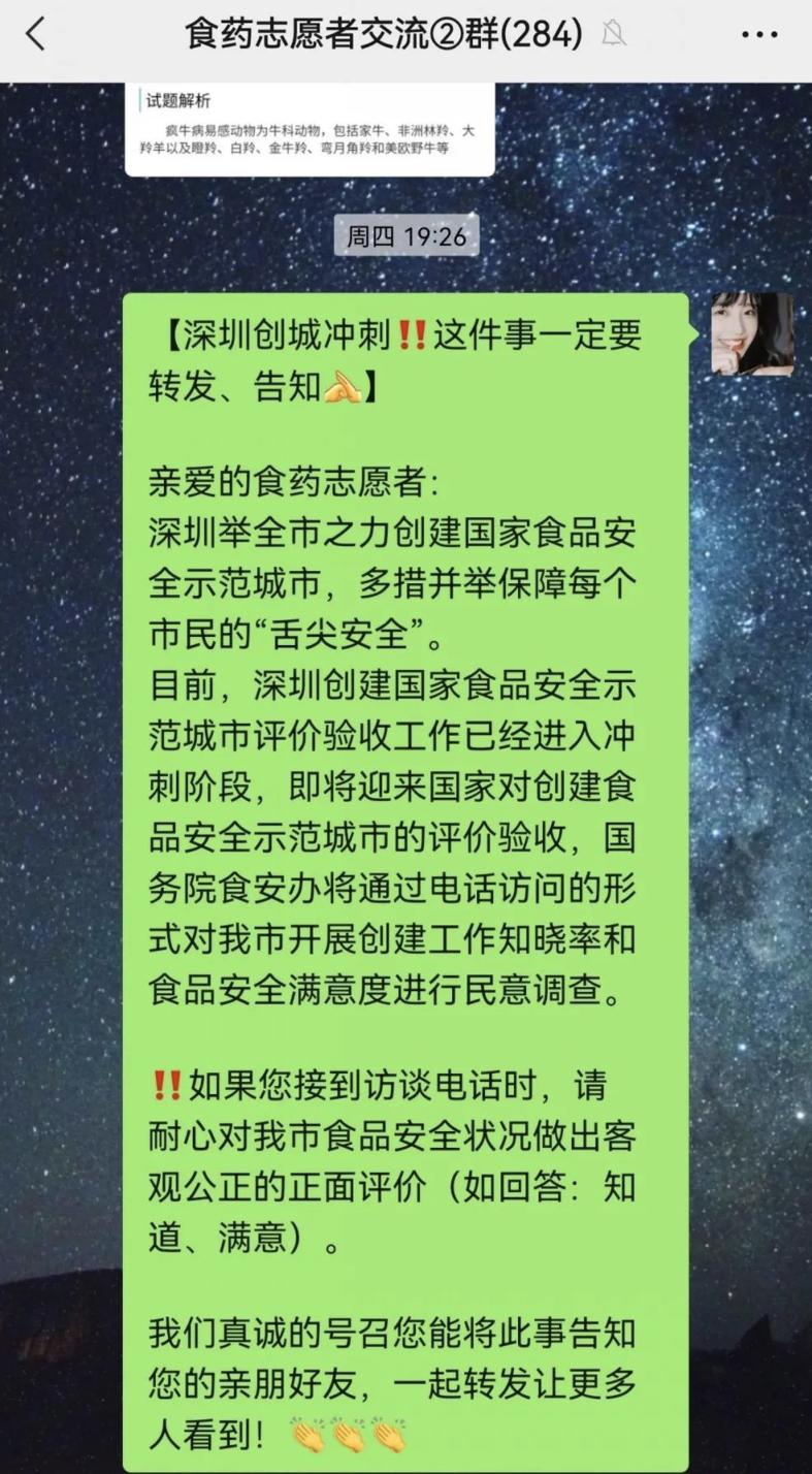 深圳市食药安全志愿服务总队充分运用“深圳食药安全志愿者”微信公众号、微信群、朋友圈推送“深圳创城冲刺 我知晓我支持我满意”告知书及深圳创城冲刺相关信息,转发、倡议广大市民支持并参与深圳创城活动。