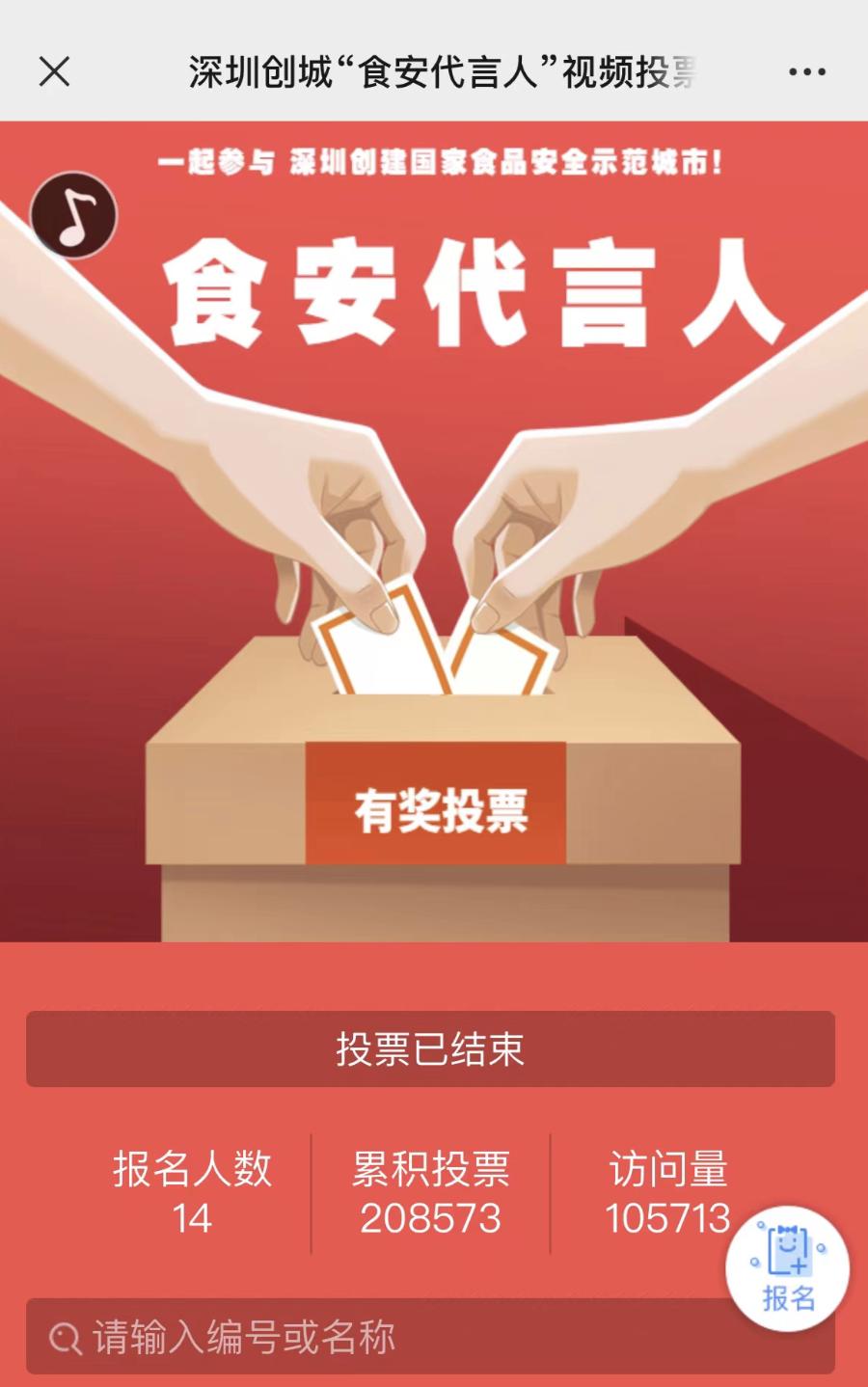 积极开展H5有奖投票活动,于今年10月11日上线深圳创城“食安代言人”有奖投票活动,活动参与人数突破10万人次,累计投票超20万次,活动获得了企业员工、食药志愿者、学生等深圳各界人士踊跃参与。