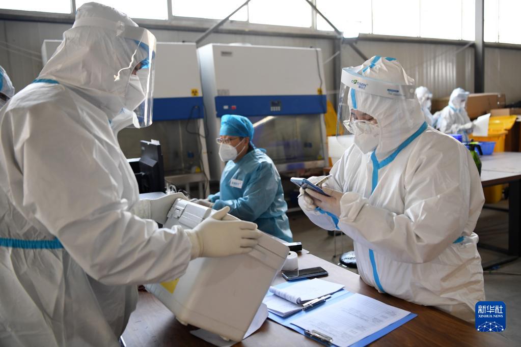 10月24日,在“猎鹰号”硬气膜实验室外,工作人员在预处理区交接核酸样本。