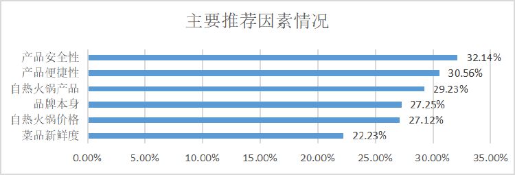 同时,在选购自热火锅时,产品安全性仍是消费者最关注的因素。在本次调查中,消费者选购自热火锅时推荐最多的因素为“产品安全性”占比为32.14%,其次是“产品便捷性”占比为30.56%,排名推荐因素最低为其“菜品新鲜度”占比为22.23%。消费者认为自热火锅在提供便捷的同时仍需提升菜品的新鲜度。
