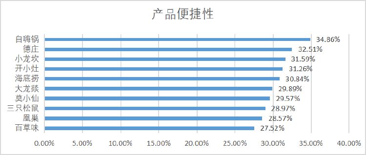 本次调查中,30.56%的消费者在推荐因素中选择“产品便捷性”。在该推荐原因中,自嗨锅自热火锅的消费者选择该推荐原因占比最高,为34.86%;其次是德庄,为32.51%,第三是小龙坎,为31.59%。