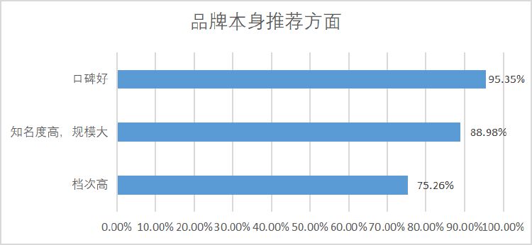 调查发现,选择自热火锅“品牌本身”推荐因素的消费者中,占有95.35%的消费者认为口碑好是选择该因素的重要原因,其次有88.98%的消费者认为“知名度高,规模大”是选择自热火锅“品牌方面”作为推荐因素的重要缘由。
