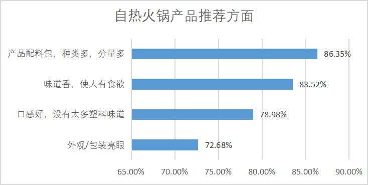 调查发现,选择“自热火锅产品”方面推荐因素的消费者中,占有86.35%的消费者认为产品配料包,种类多,分量多是选择该因素的重要原因,其次有83.52%的消费者认为味道香,使人有食欲方面作为推荐因素的重要缘由。