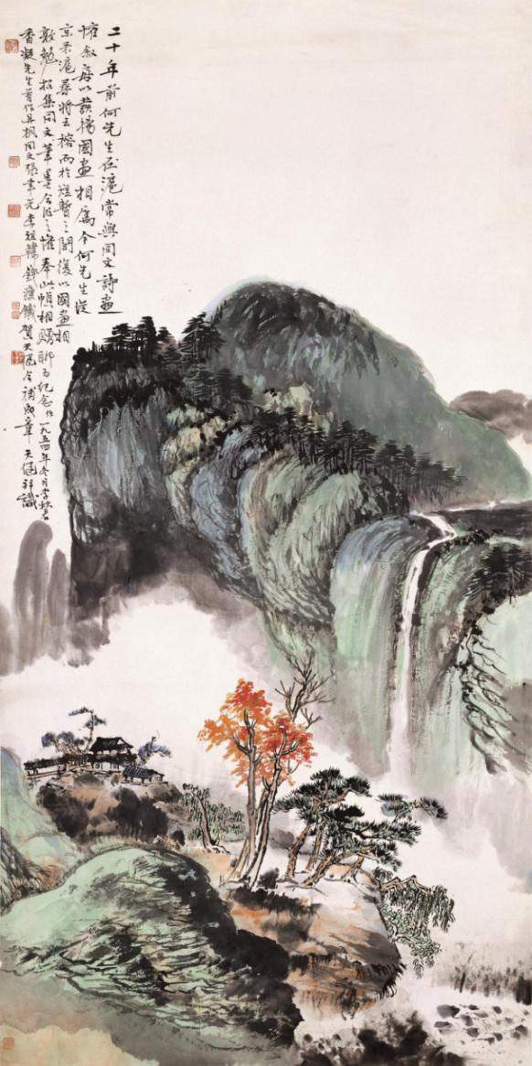 青山红树 何香凝、李秋君、张聿光、李祖韩、钱瘦铁、贺天健 纸本设色 137 cm×69 cm 1954年 何香凝美术馆藏