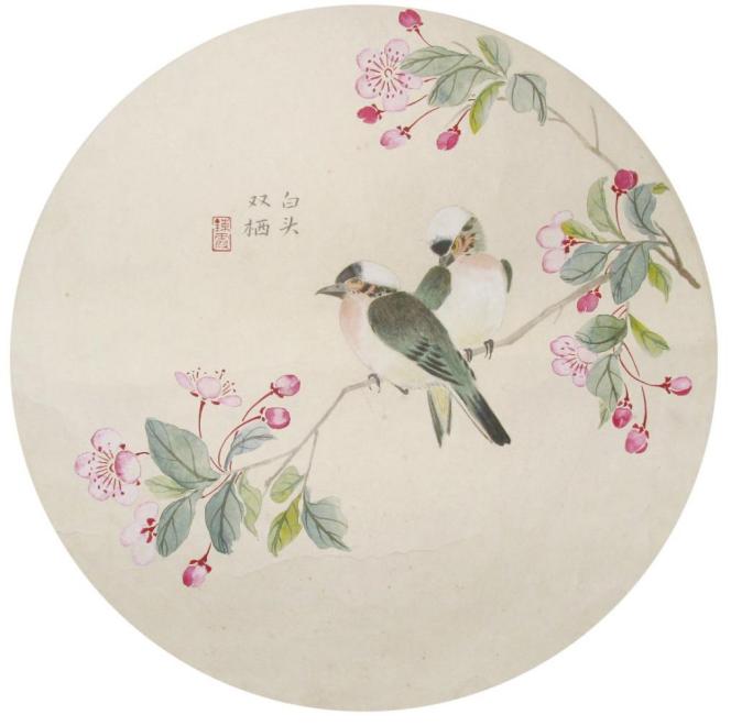 《双栖白头》周鍊霞 纸本设色 38 cm×38 cm 年代不详 上海中国画院藏
