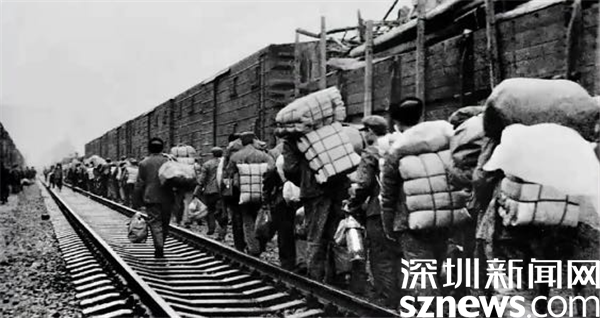 1979年基建工程兵的第一批先遣部队抵达深圳,下火车时的情景。摄影/周顺斌
