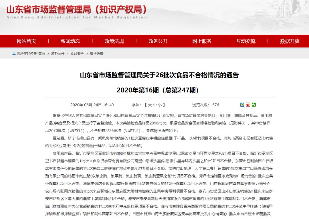 2020年6月24日,山东省市场监督管理局关于26批次食品不合格情况的通告2020年第16期(总第247期),1批次鸡蛋中氟虫腈指标不合格。