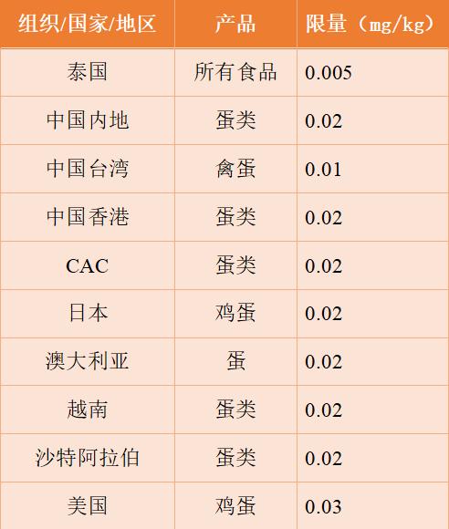 中国内地GB 2763-2021《食品安全国家标准 食品中农药最大残留限量》规定,蛋类中氟虫腈最大残留限量应≤0.02 mg/kg,中国香港规定蛋类中氟虫腈限量与内地一致。