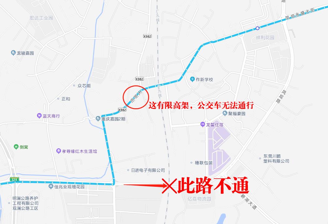 由于凤观路铁路桥修路,道路无法通行,深莞2线采用的是绕行天新街通过,但天新街上有一处限高架,公交车无法通过。