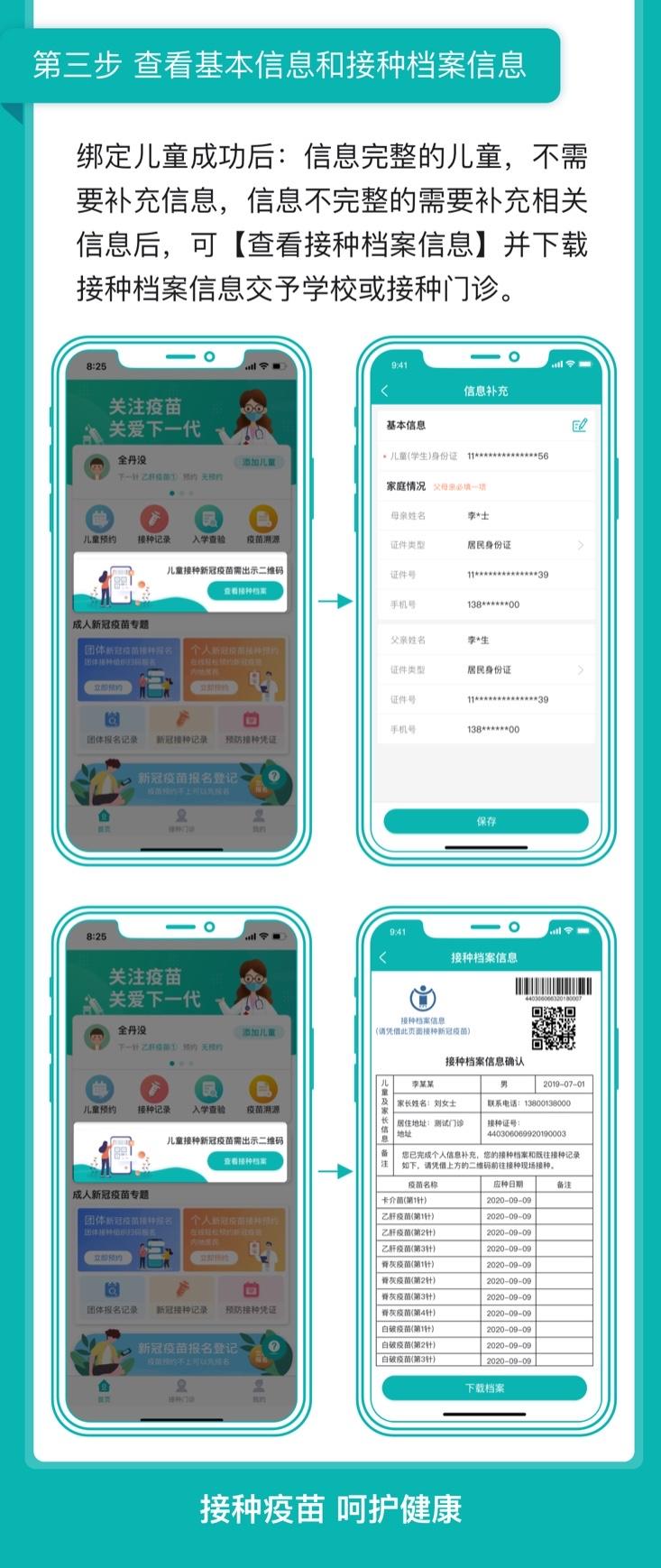 监护人通过粤苗APP或粤健通微信小程序预先登记孩子和家长的信息,绑定孩子在省疫苗系统中已有的档案,并自助完善档案中孩子身份证号码、父母姓名和身份证号码等必需信息,生成接种档案信息二维码。