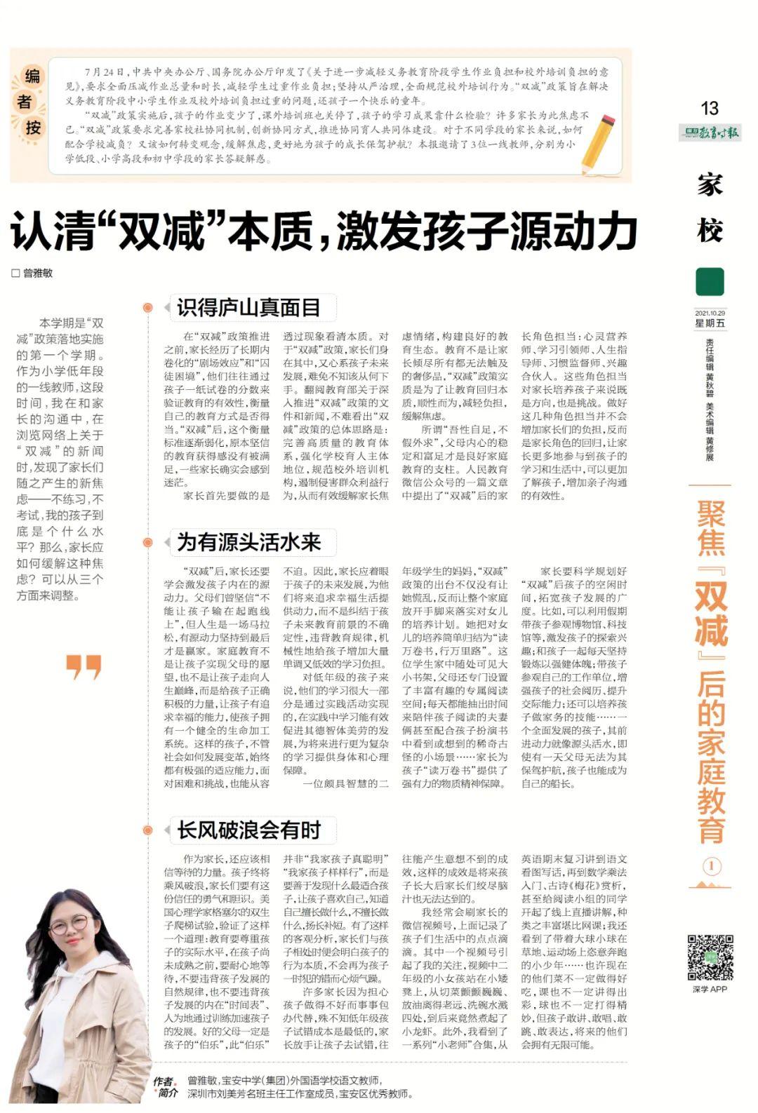 所谓“吾性自足,不假外求”,父母内心的稳定和富足才是良好家庭教育的支柱。人民教育微信公众号的一篇文章中提出了“双减”后的家长角色担当:心灵营养师、学习引领师、人生指导师、习惯监督师、兴趣合伙人。这些角色担当对家长培养孩子来说既是方向,也是挑战。做好这几种角色担当并不会增加家长们的负担,反而是家长角色的回归,让家长更多地参与到孩子的学习和生活中,可以更加了解孩子,增加亲子沟通的有效性。