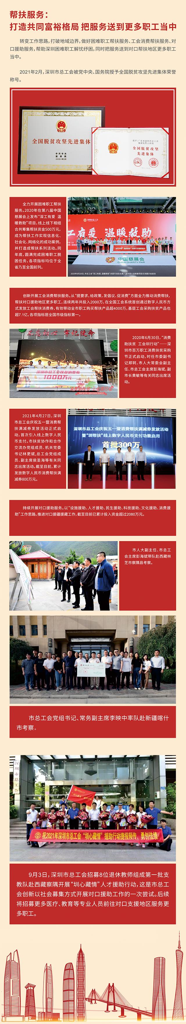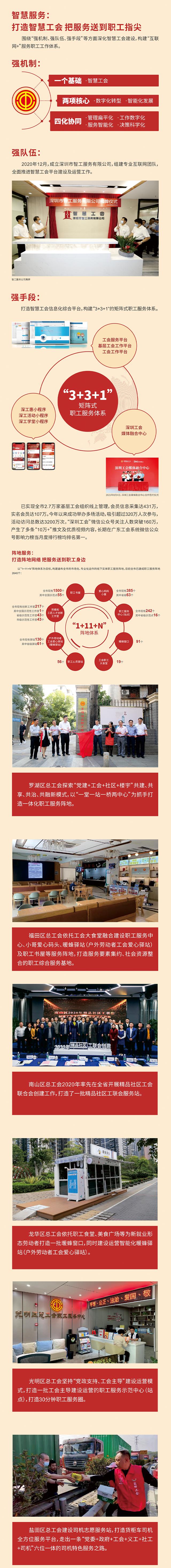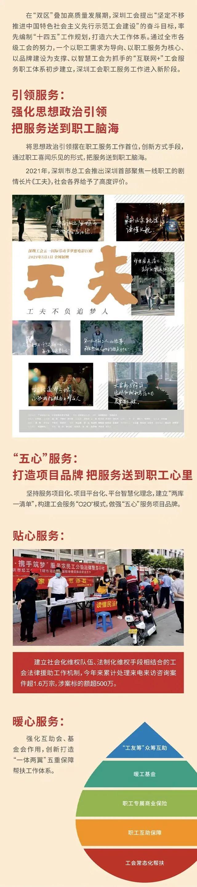 近年来,深圳市总工会深入贯彻落实上级工会和深圳市委工作部署,认真履行维护职工合法权益、竭诚服务职工群众的基本职责,积极打造“互联网+职工服务、基层工会组织建设、工会支撑保障”等六大工作体系,建立健全市街道工会职工服务阵地,切实提升广大职工群众的获得感、幸福感、安全感,工会职工服务工作取得了新进展、新成效。