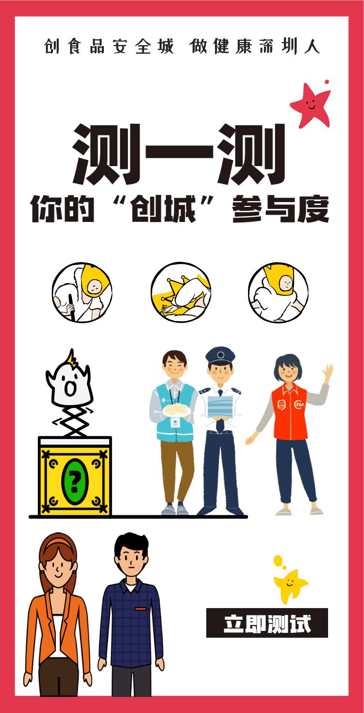 深圳创建国家食品安全示范城市的工作正在如火如荼地进行不止是监管员、检测员、志愿者众多餐饮服务单位、行业机构、市民也纷纷参与其中让深圳掀起了一股“创城”热深圳地标亮起“创城”标语各区、企业花式宣传推广超20万人次参与深圳创城“食安代言人”投票活动你在其中扮演了怎样的角色呢?赶快来一起来测一测吧点击下方图片即可开始↓测试完成后选择“点击分享”按钮还可以生成海报进行转发分享这样更多小伙伴就可以通过扫码海报上的二维码参与测试啦选择“再测一次”则有可能获得不同的结果哦~食安君温馨提醒近期,国务院食安办将通过电话访问的形式对深圳市开展创建工作知晓率和食品安全满意度民意调查如果市民朋友有幸接到了全国社情民意调查热线12340请耐心接听、客观评价牢记最佳答案回答 我知道、我满意为创城努力、为深圳加油!编辑整理 深圳食药安办转载请注明以上内容点在看,让大家一起来!