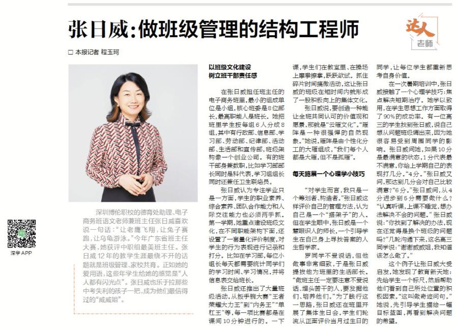 深圳博伦职校的德育处助理、电子商务班语文老师兼班主任张日威喜欢说一句话:“让老鹰飞翔,让兔子赛跑,让乌龟游泳。”今年广东省班主任大赛,她获评中职组最美班主任。张日威12年的教学生涯最绕不开的话题就是班级管理、家校共育。正如她的爱用语,这些年学生给她的感觉是“人人都有闪光点”。张日威也乐于拉那些中考失利的孩子一把,成为他们最信得过的“威威姐”。