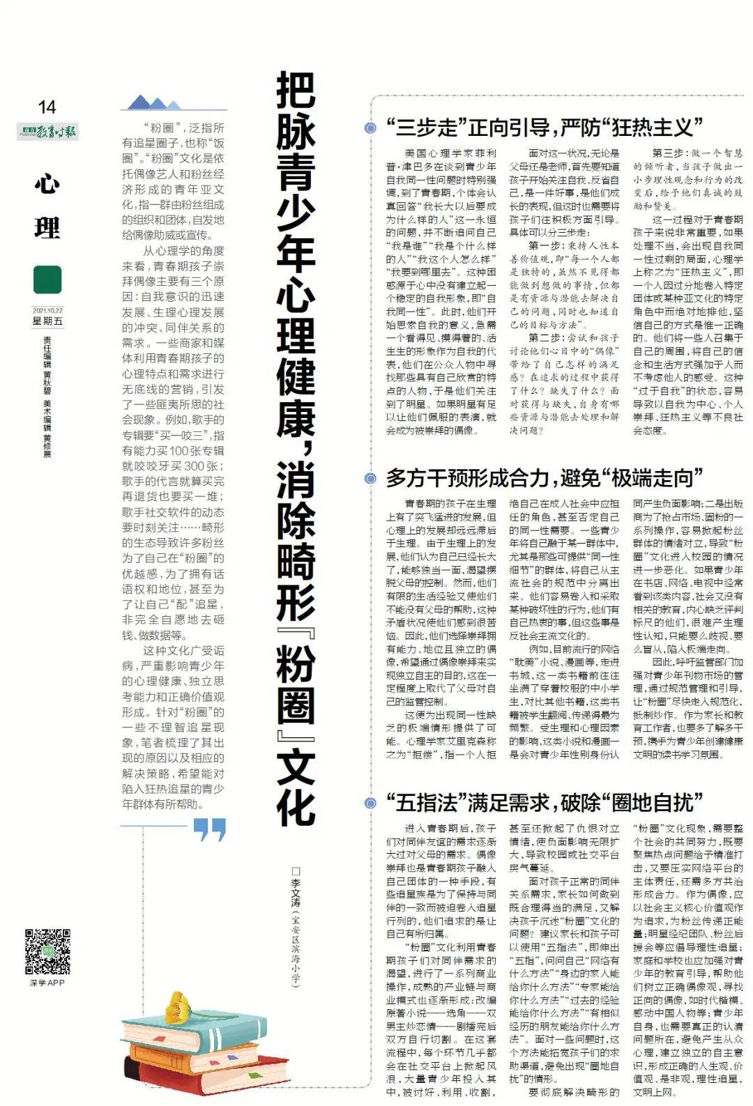 面对孩子正常的同伴关系需求,家长如何做到既合理得当的满足,又解决孩子沉迷“粉圈”文化的问题?建议家长和孩子可以使用“五指法”,即伸出“五指”,问问自己“网络有什么方法”“身边的家人能给你什么方法”“专家能给你什么方法”“过去的经验能给你什么方法”“有相似经历的朋友能给你什么方法”。面对一些问题时,这个方法能拓宽孩子们的求助渠道,避免出现“圈地自扰”的情形。