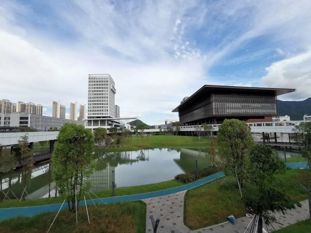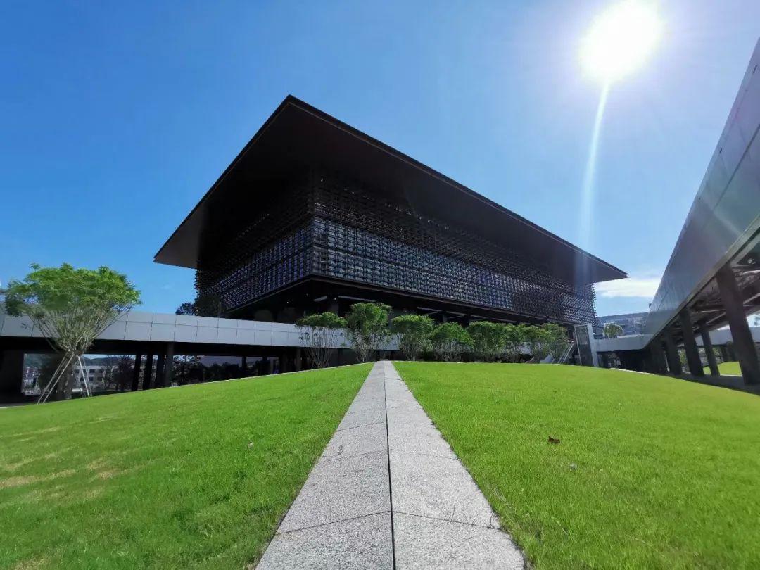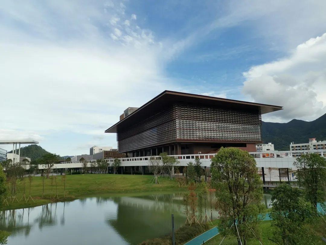 深圳技术大学图书馆位于校内核心位置,在景观湖畔,紧邻深圳技术大学行政楼。它就像校园里的一颗耀眼的明珠镶嵌在深圳技术大学“科技轴”与“景观轴”的交汇处。