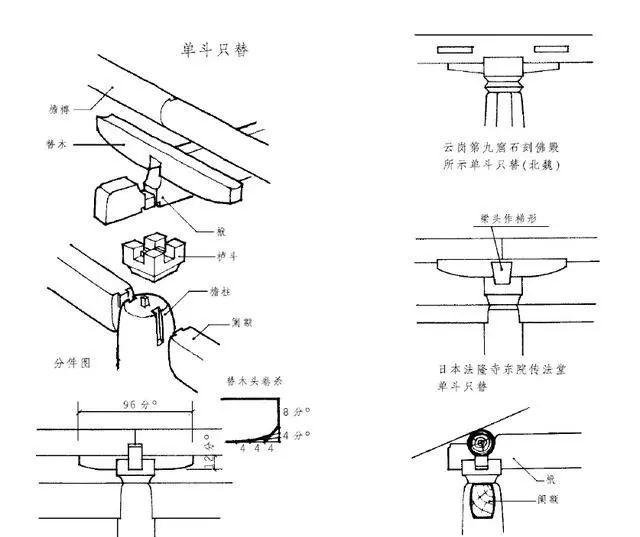 单斗支替,是早期建筑中的经典概念。它是用一个栌斗和一个替木,把柱子、梁头、椽檩三者结合在一起,非常简洁实用,结构上也稳定,在大同云冈石窟中有相应的石刻例子,太原晋祠鱼沼飞梁为宋代实例。
