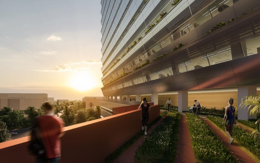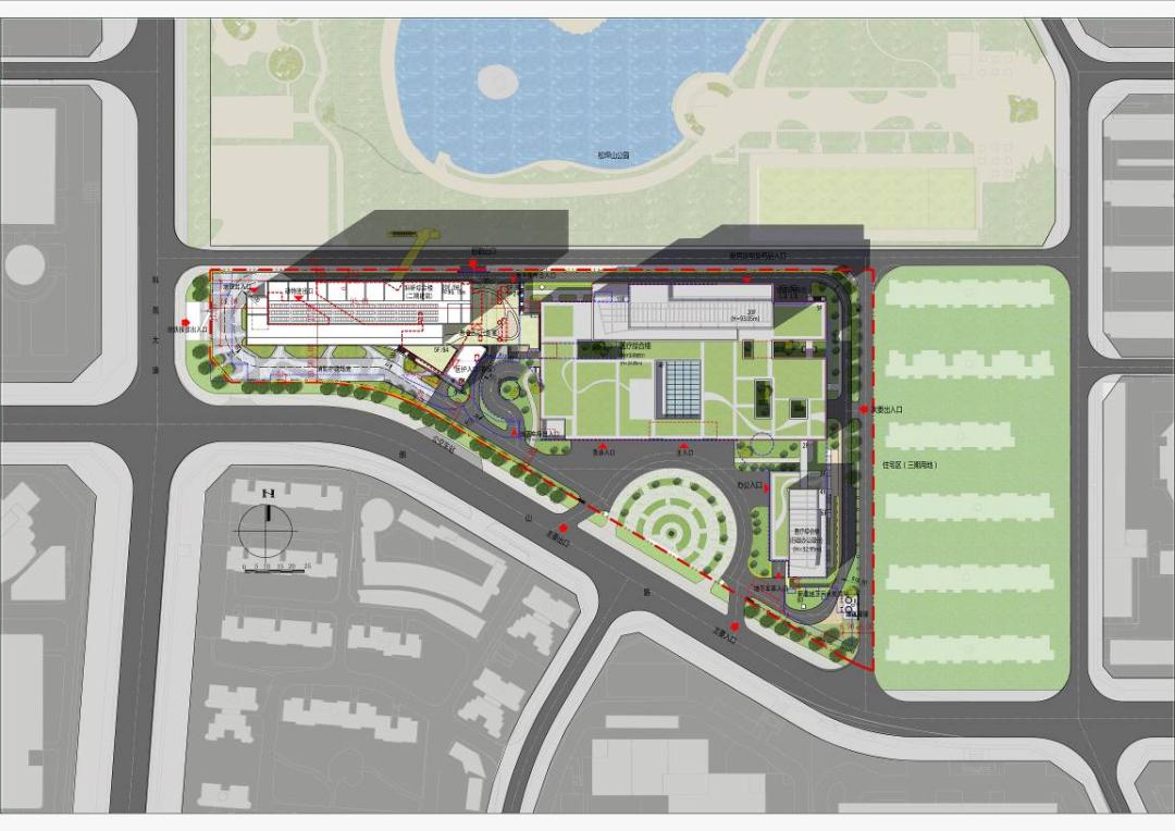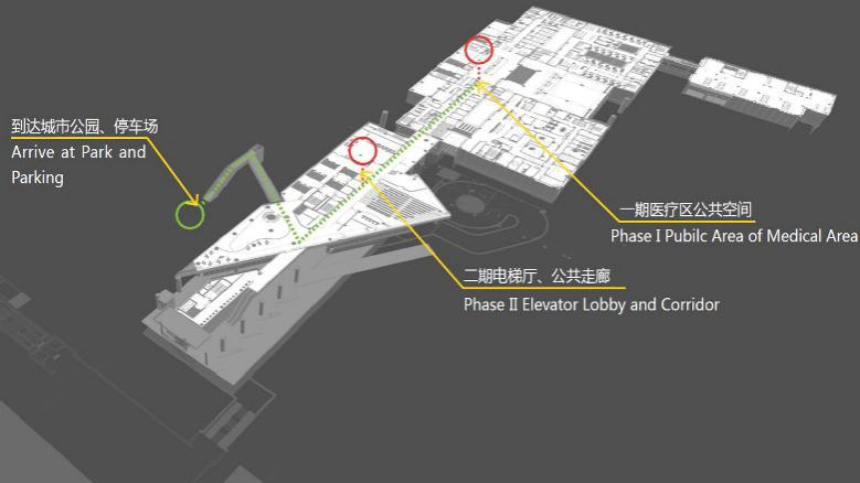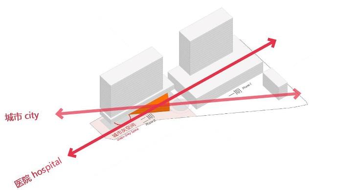 另外,在二层北侧预留设置天桥通往城市公园的条件,一期患者、医护人员,二期科研办公人员、患者可直达公园,充分利用社会停车场。