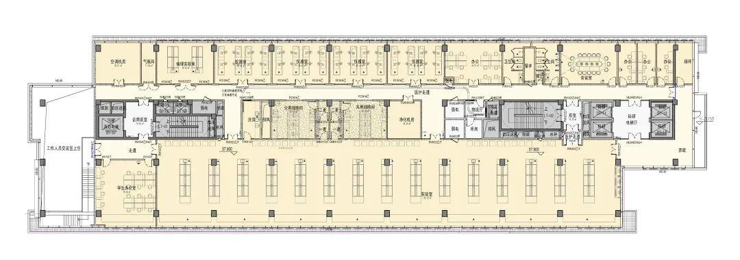 项目作为主要功能为科研实验的建筑,建筑空间需要适应科研需求的快速变化,所以在布局流线上进行整体规划,在流线简洁合理的前提下,对空间进行分隔,形成不同组合的大开间和小隔间实验区。