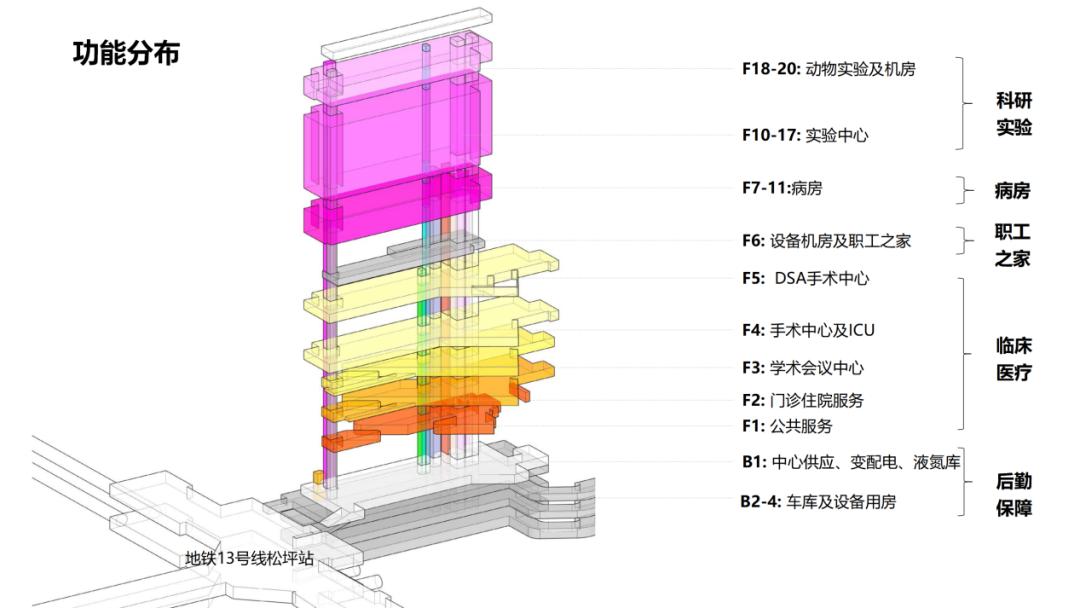 项目包含了生物实验室(分子实验室、动物实验室、GCP实验室)、大数据中心、生物样本库等各项转化医学功能单位,也包含了负压手术室、负压病房等临床医疗单位,以及门诊接待大厅、自助服务大厅等公共服务功能单位。