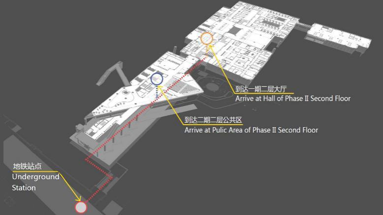 在空间流线设计上,采用了城市共生的设计理念,将首层设计为交通服务中心,包括地铁出入口、患者家属服务大厅、入口大厅等。充分利用与地铁接驳的有利条件,在建筑西侧布置了自动扶梯,引导人流通往二层及一期建筑。