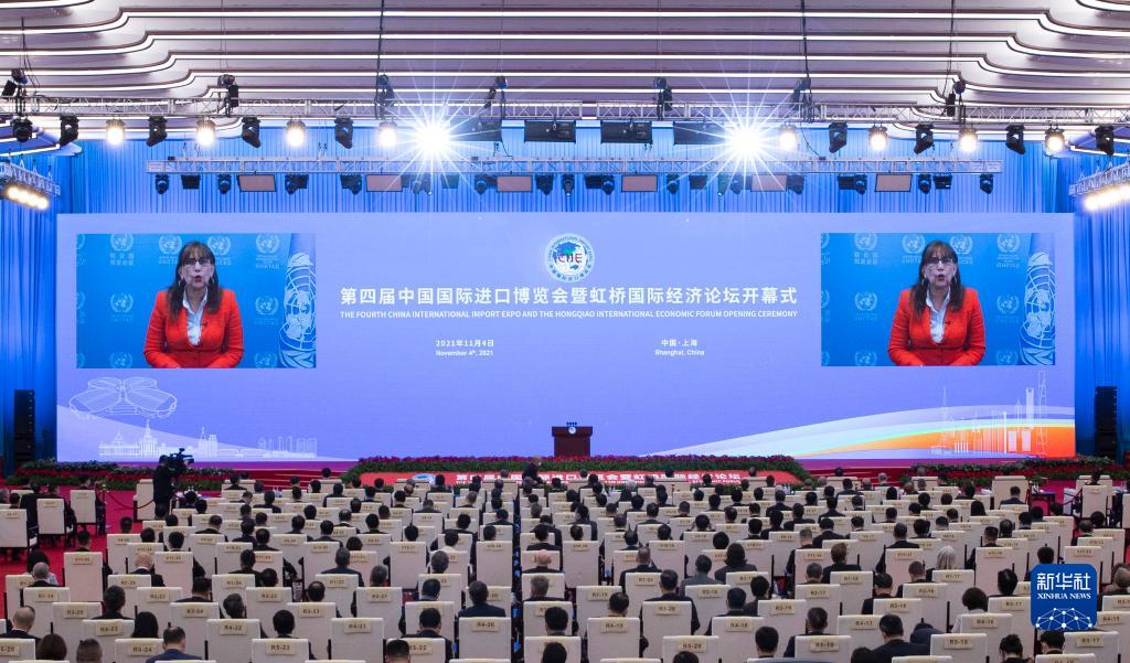11月4日晚,第四届中国国际进口博览会开幕式在国家会展中心(上海)举行。这是联合国贸易和发展会议秘书长格林斯潘在开幕式上以视频方式致辞。新华社记者金立旺摄