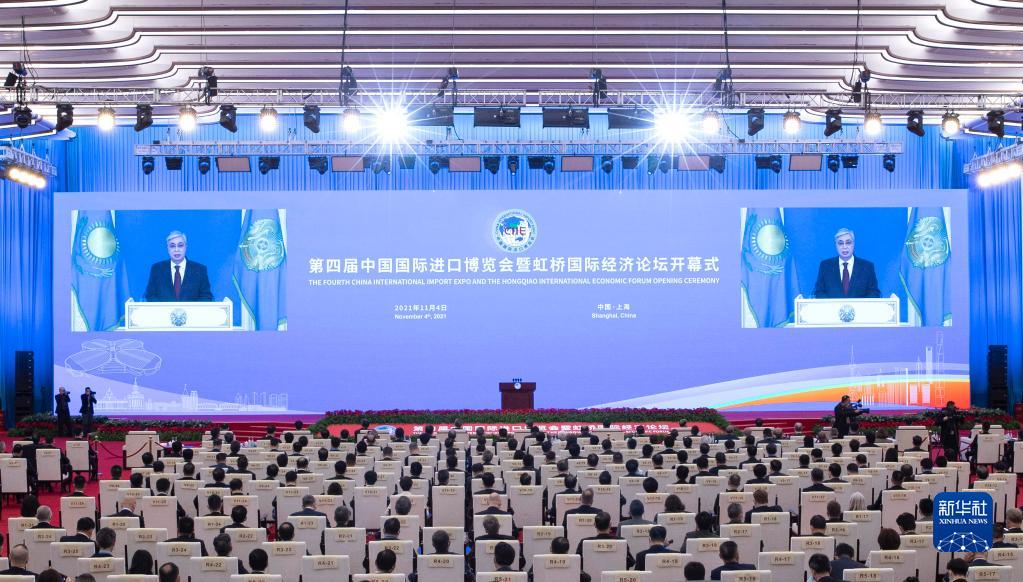 11月4日晚,第四届中国国际进口博览会开幕式在国家会展中心(上海)举行。这是哈萨克斯坦总统托卡耶夫在开幕式上以视频方式致辞。新华社记者金立旺摄