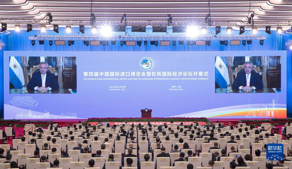 11月4日晚,第四届中国国际进口博览会开幕式在国家会展中心(上海)举行。这是阿根廷总统费尔南德斯在开幕式上以视频方式致辞。新华社记者金立旺摄