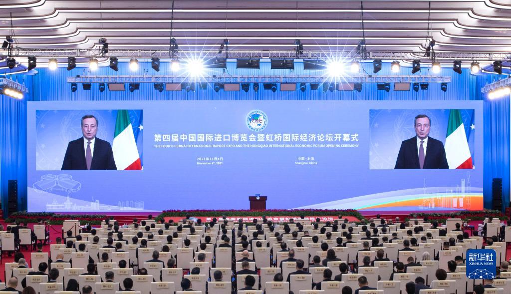 11月4日晚,第四届中国国际进口博览会开幕式在国家会展中心(上海)举行。这是意大利总理德拉吉在开幕式上以视频方式致辞。新华社记者金立旺摄